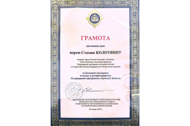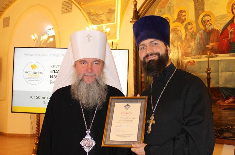 Председатель Синодального Отдела религиозного образования и катехизации митрополит Екатеринбургский и Верхотурский Евгений наградил грамотой священника Стахия Колотвина, и. о. ответственного за миссионерскую деятельность, ответственного за распространение Патриаршей программы изучения Библии в